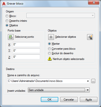 A caixa de diálogo Gravar bloco proporciona um método conveniente de salvar a peça do desenho atual em um arquivo de desenho diferente ou salvar uma definição de bloco especificada como um arquivo de desenho separado.