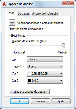 As guias na caixa de diálogo contêm configurações para ajustar cada um dos três tipos de análise de sólido e de superfície: zebra (continuidade), curvatura e de ângulo do modelo.