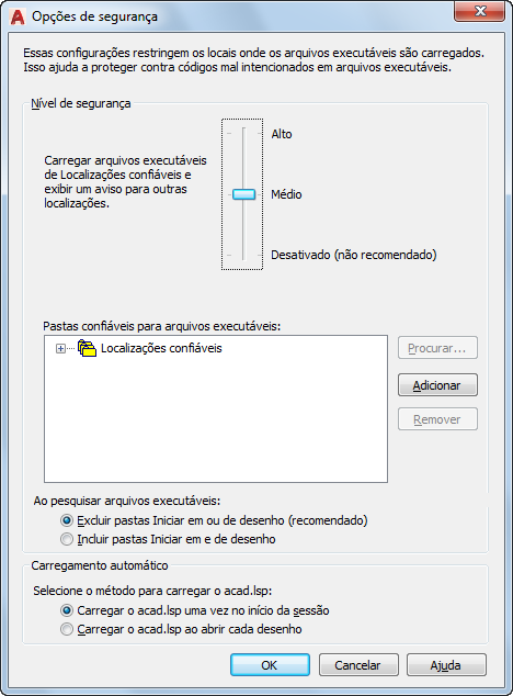 Controla as restrições de segurança para executar arquivos executáveis no AutoCAD.