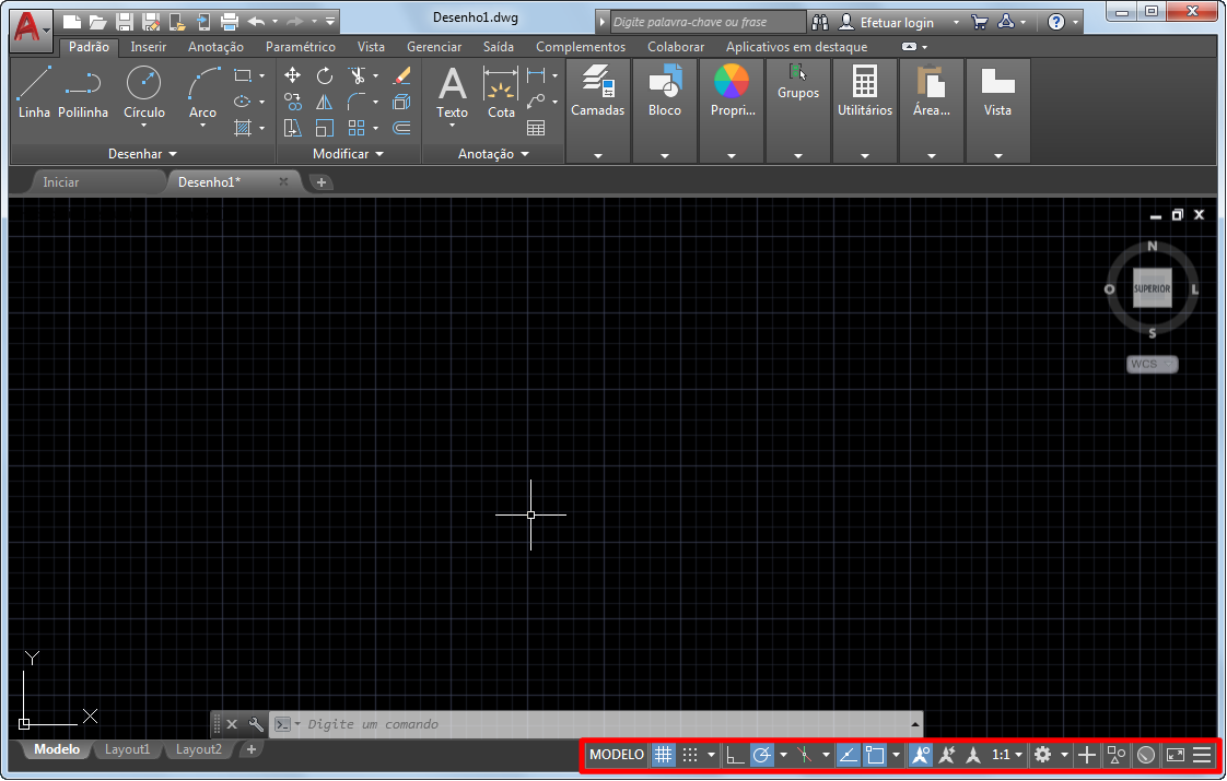 A barra de status exibe a posição do cursor, ferramentas de desenho e ferramentas que afetam o ambiente de desenho.