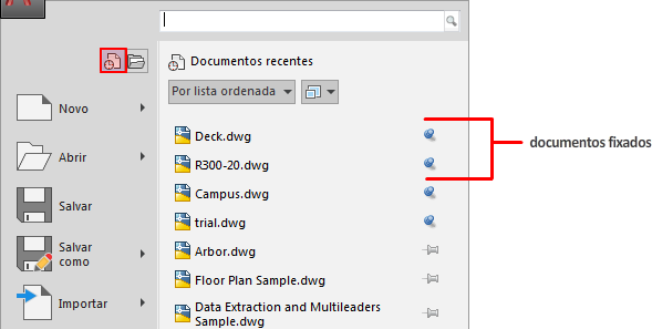 É possível manter um arquivo listado, independentemente dos arquivos que salvar posteriormente, ao clicar no botão de pino à direita do nome do arquivo. O arquivo é exibido na parte inferior da lista de documentos recentes até que se desative o botão de pino.
