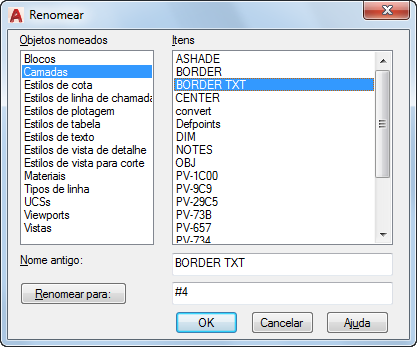 Altera os nomes atribuídos aos objetos nomeados, como camadas e estilos de cota.