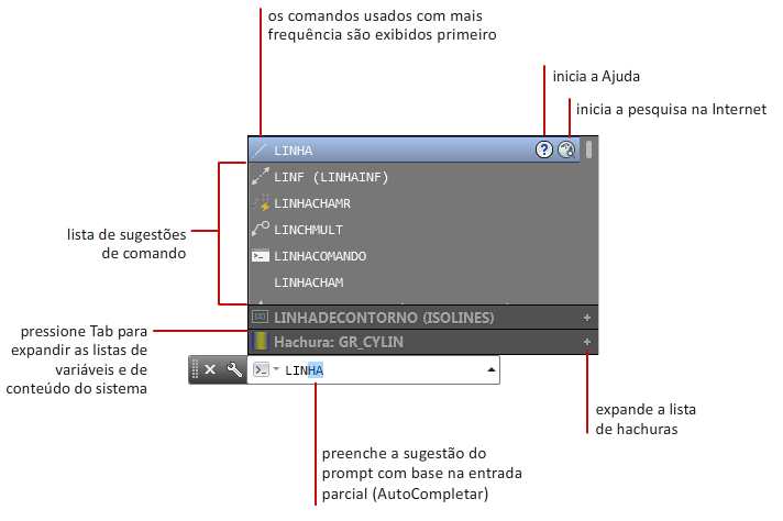 Uma lista dos comandos sugeridos é exibida assim que você insere as primeiras letras de um comando na janela de comando ou na caixa de entrada dinâmica. Por padrão, a lista tem as seguintes características: