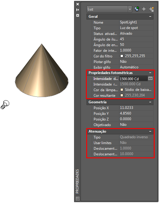 Quando a variável de sistema LIGHTINGUNITS é definida como 1 (unidade Americana) ou 2 (unidades Internacional SI) para a luz fotométrica, propriedades adicionais ficam disponíveis para a luz de spot. As propriedades fotométricas a seguir podem ser definidas usando a paleta Propriedades:
