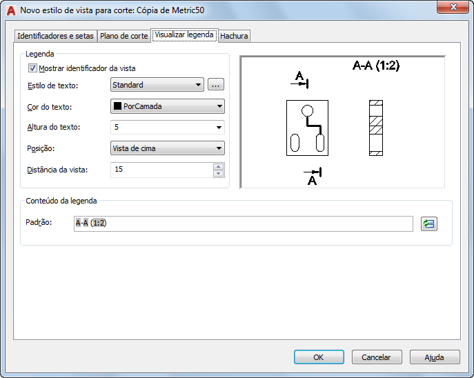 Define a posição da legenda da vista em corte em relação à vista em corte.