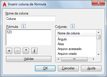 Exibe os nomes de colunas dos dados do desenho extraídos e de dados externos (se um vínculo de dados foi estabelecido). Os nomes das colunas podem ser clicados duas vezes para serem adicionados no campo Fórmula ou arrastados da lista Coluna para o campo Fórmula. Colunas de fórmula existentes não são listadas e não podem ser usadas como valores para a criação de colunas adicionais de fórmula.