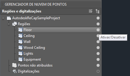Em ReCap, é possível combinar as digitalizações da nuvem de pontos em um projeto e selecionar as áreas da nuvem de pontos combinadas e defini-las como regiões. No AutoCAD, o Gerenciador de nuvem de pontos permite visualizar e gerenciar projetos de nuvem de pontos, regiões e digitalizações que foram criados no ReCap antes de serem importados ou anexados a um desenho. Para exibir o Gerenciador de nuvem pontos, uma nuvem de pontos anexada a um desenho deve estar aberta e ativa.