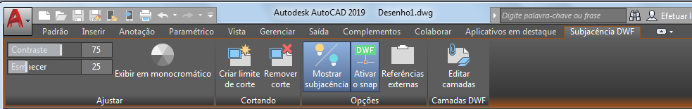Altera as opções da exibição, corte, camada e osnap da subjacência DWF.