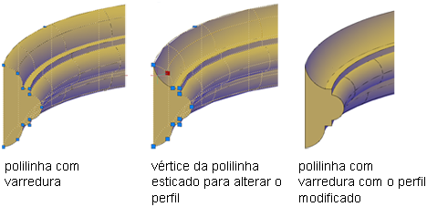 Sólidos e superfícies varridos exibem alças no perfil de varredura assim como no caminho de varredura. Você pode arrastar estas alças para modificar o sólido ou superfície.