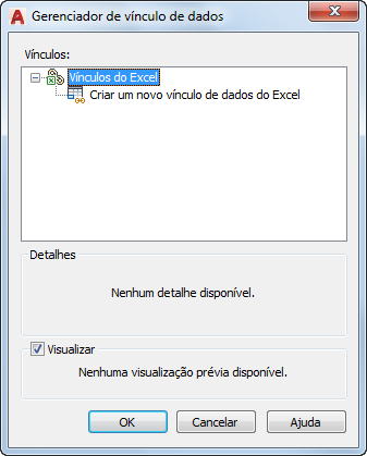 Lista os vínculos de dados do Microsoft Excel dentro do desenho. Se o ícone exibe uma cadeia vinculada, então o vínculo dos dados é válido. Se o ícone exibe uma cadeia quebrada, então o vínculo dos dados está quebrado.