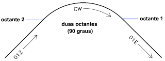 Ele é chamado de arco oitante pois possui um ou mais oitantes de 45 graus, iniciando e terminando em um limite oitante. Os oitantes são numerados no sentido anti-horário a partir da posição de 3 horas, como mostrado na ilustração a seguir. ![]() A especificação de arco é 10,radius,(-)0SC O raio pode ser qualquer valor de 1 a 255. O segundo byte de especificação indica a direção do arco (sentido anti-horário se positivo e sentido horário, se negativo); seu oitante inicial ( s , um valor de 0 a 7) e o número de oitantes que ele possui ( c , um valor de 0 a 7, no qual 0 é igual a oito oitantes ou um círculo completo). Você pode utilizar parênteses para melhorar a leitura. Por exemplo, considere o seguinte fragmento de uma definição de forma: ...012,10,(1,-032),01E,... Esse código desenha um vetor de uma unidade para cima e à direita, um arco no sentido horário a partir do oitante 3 (com um raio de uma unidade para dois oitantes) e, em seguida, um vetor de uma unidade para baixo e à direita, como mostrado na ilustração a seguir. ![]() |