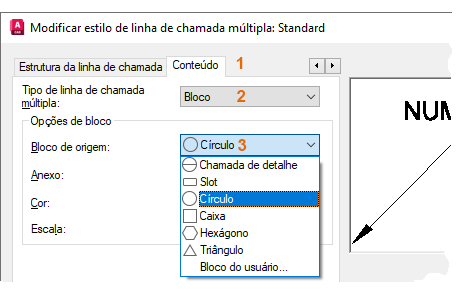 Em seguida, clique na guia Conteúdo (1), altere o tipo de linha de chamada múltipla de Textom para Bloco (2). Para Bloco de origem, escolha Círculo (3). A seguir, clique em OK.