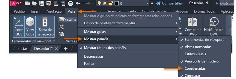 Uma marca de seleção deve ser inserida na frente da guia Coordenadas no menu e o painel Coordenadas deve agora ser exibido na guia Vista.