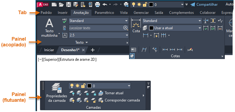 Os painéis em uma guia da faixa de opções podem ser tornados flutuantes na janela do aplicativo. Quando um painel da faixa de opções é flutuante, ele fica visível independentemente da guia da faixa de opções que estiver ativa. Isso pode ser muito vantajoso quando você alterna entre vários tipos diferentes de ferramentas com frequência. Por exemplo, você pode desejar tornar as camadas ou os painéis Propriedades flutuantes, para que estejam visíveis, mesmo quando as guias Inserir ou Anotar estiverem em primeiro plano.