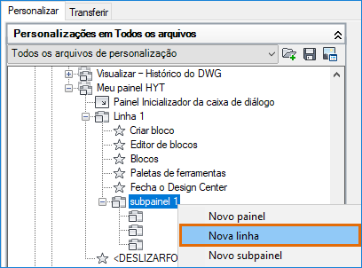 No editor CUI, localize o painel da faixa de opções recém-criado (Meu painel HYT), se necessário.