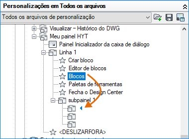Digamos que você queira manter os botões de comando menores, mas organizá-los em várias linhas no painel. As etapas a seguir explicam como criar um subpainel e como definir o posicionamento dos botões de comando da paleta Blocos, das Paletas de ferramentas e do DesignCenter em várias linhas menores.