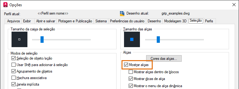 As alças são pequenos quadrados, retângulos e triângulos que aparecem em objetos selecionados. É possível esticar, mover, copiar, rotacionar, dimensionar e espelhar objetos usando as alças sem precisar inserir nenhum comando.