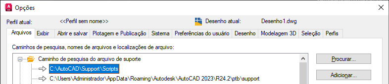 Nota: É possível gerenciar as pastas da configuração do Caminho de pesquisa do arquivo de suporte do AutoCAD na guia Arquivos da caixa de diálogo Opções (comando OPCOES). Para obter informações sobre como adicionar pastas à configuração Caminho de pesquisa do arquivo de suporte do AutoCAD, consulte Para modificar caminhos de pesquisa do arquivo de suporte.