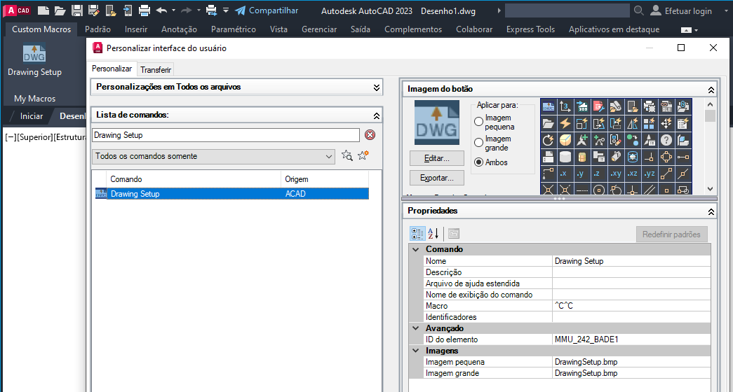 É possível definir uma macro com o comando SCRIPT para executar um script específico em um botão da faixa de opções. Em seguida, veja a aparência de uma macro que inicia o comando SCRIPT e executa um arquivo de script denominado drawing_setup.scr: