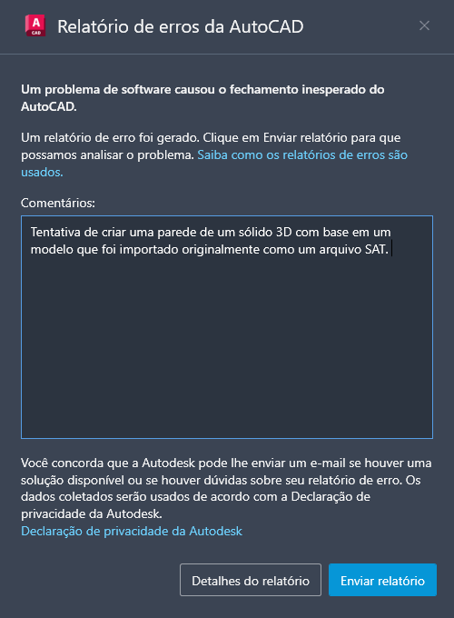 Após salvar todos os desenhos abertos com alterações não salvas, a caixa de diálogo Relatório de erros do AutoCAD deverá ser exibida. Nessa caixa de diálogo, é possível nos enviar um relatório de erros. O relatório de erros inclui informações sobre o estado atual do programa e da estação de trabalho e pode incluir informações opcionais, como o que você estava fazendo no momento do erro. Os relatórios de erros são usados para melhorar a estabilidade do produto.