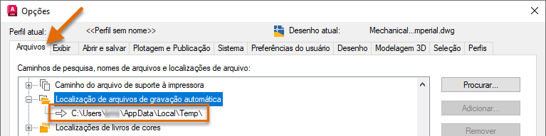 Nota: Os arquivos de desenho dos recursos de backup (BAK) e salvar automaticamente (SV$) não podem ser abertos diretamente no AutoCAD. É necessário alterar a extensão de arquivo de BAK ou SV$ para DWG para que eles possam ser abertos.