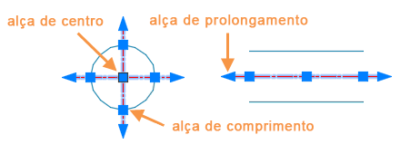 As marcas de centro e as linhas de centro também podem ser editadas usando alças. Se passar o cursor sobre uma alça, serão exibidas as cotas dinâmicas da linha de extensão.