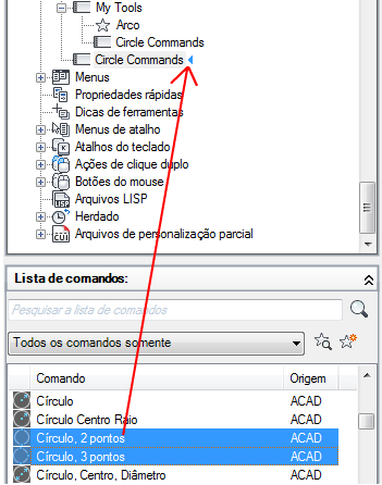 4. No painel Lista de comandos, arraste o comando que desejar adicionar ao menu desdobrável da barra de ferramentas no painel Personalizações em <nome do arquivo>.