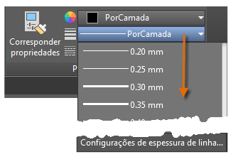 É possível deixar a espessura de linha definida como Porcamada ou você pode especificar um valor que sobrepõe a espessura de linha da camada. Em alguns casos, as espessuras de linha aparentam ser iguais, pois elas são exibidas com larguras de pixel aproximadas em um monitor. No entanto, elas serão impressas com a espessura correta.