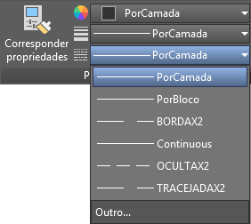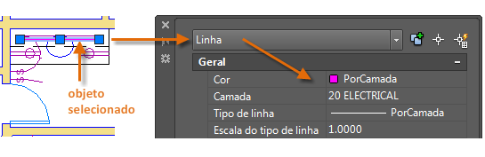 Observe que as propriedades atuais do objeto selecionado são exibidas na paleta Propriedades. É possível alterar as propriedades clicando em qualquer uma delas e alterando a configuração. A propriedade definida como “PorCamada” herda a configuração da sua camada. No exemplo anterior, os objetos que foram criados na camada 20 ELETRICO são roxos, já que é a cor padrão para os objetos daquela camada.