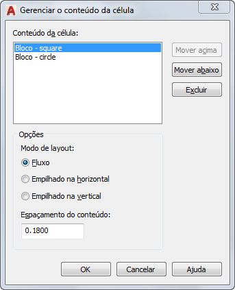 Lista todo o texto e/ou blocos na célula selecionada em ordem de aparição. O texto é indicado com a legenda Table Cell Text. Os blocos são indicados com Bloco antecedendo o nome do bloco.