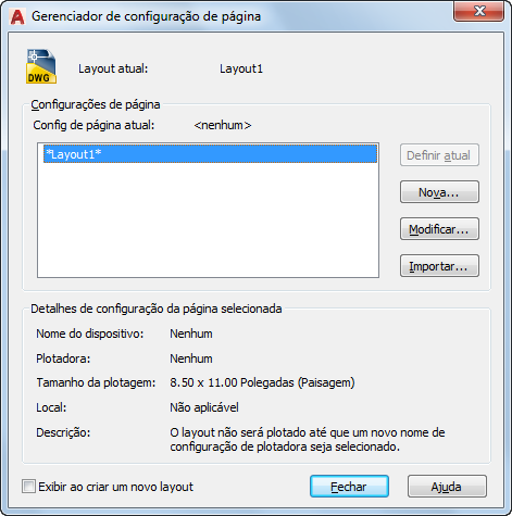 É possível criar também configurações de página nomeadas, modificar as existentes ou importar configurações de outros desenhos.