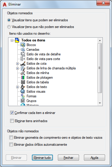 Relaciona os objetos nomeados que não são utilizados no desenho atual e que podem ser eliminados.