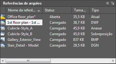A coluna nome da referência sempre exibe o desenho atual como a primeira entrada, seguido por arquivos adicionais anexados que estão listados na ordem em que foram anexados.