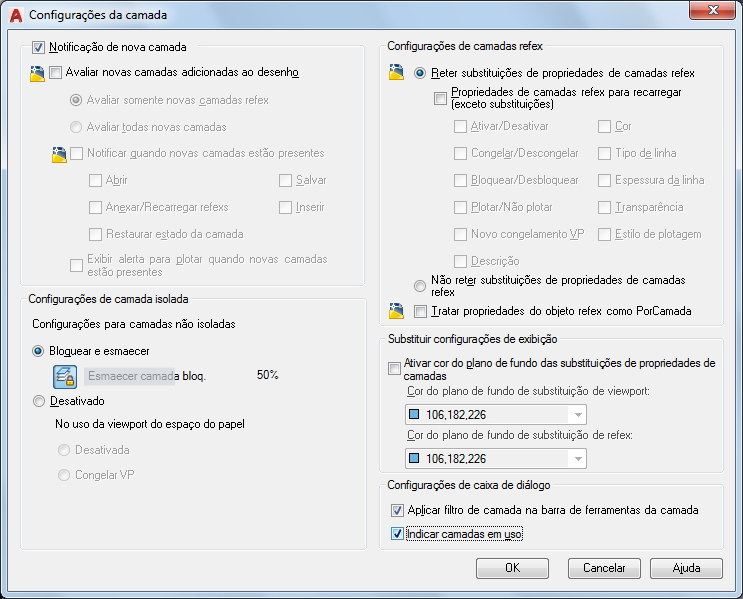 Controla quando ocorre a notificação para novas camadas, o comportamento de camadas quando algumas camadas estão isoladas, se são aplicados filtros à barra de ferramentas Camadas e a cor do plano de fundo das sobreposições de viewport no Gerenciador de propriedades de camada.