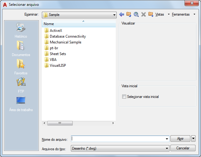 Vários comandos exibem caixas de diálogo padrão de seleção de arquivo, nas quais você pode navegar em unidades locais e de rede, além de sites FTP e pastas da Web para selecionar arquivos. Como cada caixa de diálogo pode variar um pouco, as opções possíveis serão relacionadas a seguir.