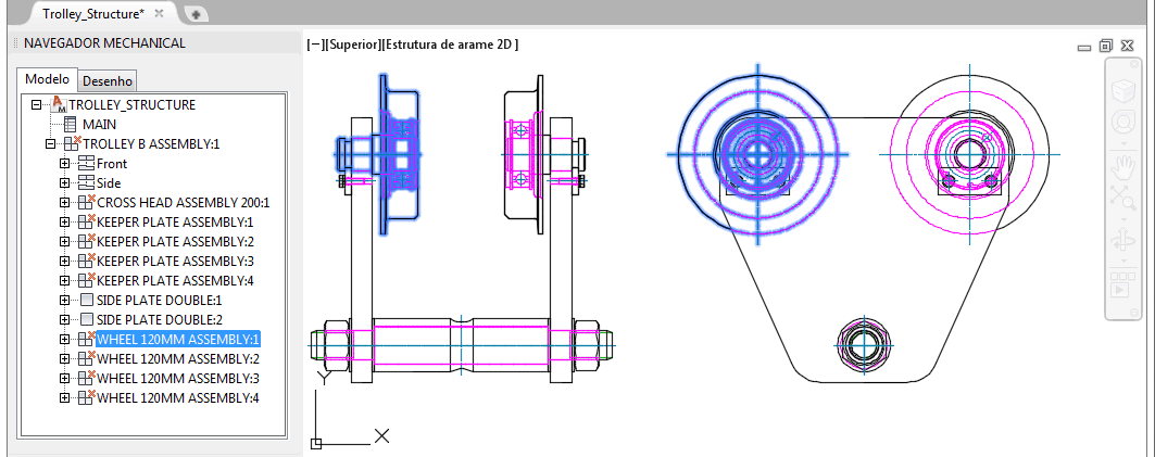Cada componente possui ao menos uma vista de componente. Neste exemplo, o componente de montagem TROLLEY B ASSEMBLY possui duas vistas de componente.