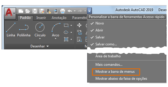 A barra de menus pode ser ativada a partir da barra de ferramentas Acesso rápido ou ao utilizar o menu suspenso IUP para personalizar a interface do usuário.