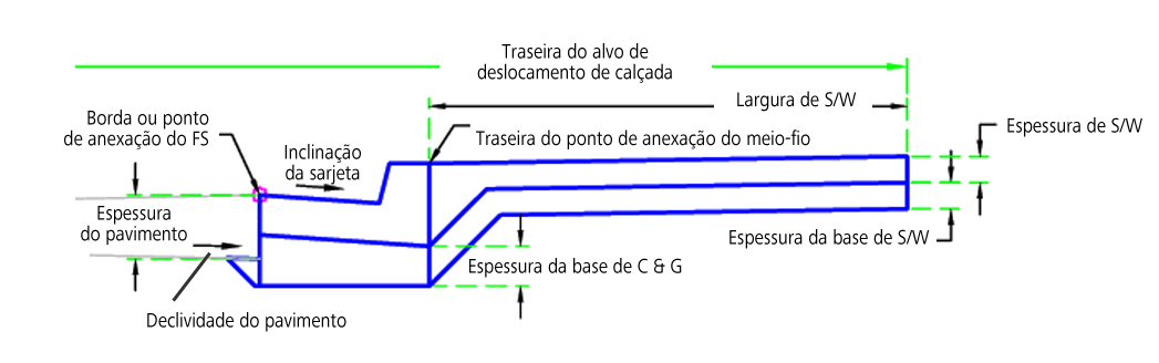 Se o tipo de calçada estiver definido como Nenhum, então será criada a calçada e a base apropriadas. Se a calçada for Desvinculada e o Deslocamento de calçada desvinculada estiver definido, então a aresta interna da calçada será ajustada. Se a Traseira do deslocamento da calçada estiver definida, então as larguras de todos os tipos de calçada serão ajustadas.