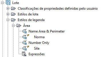 Na árvore Toolspace Configurações, a coleção Estilos de legenda contêm um ou mais tipos de estilos legenda que representam um aspecto único do objeto que esteja utilizando a mesma. A ilustração a seguir mostra a hierarquia da coleção de estilos de legenda, o tipos de estilo de legenda, e os estilos de legenda individual: