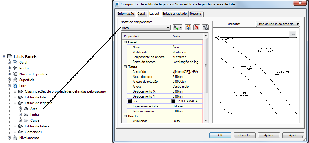 As legendas da área de lote aparecem no desenho conforme elas apareçam na visualização do Compositor de estilo de legenda