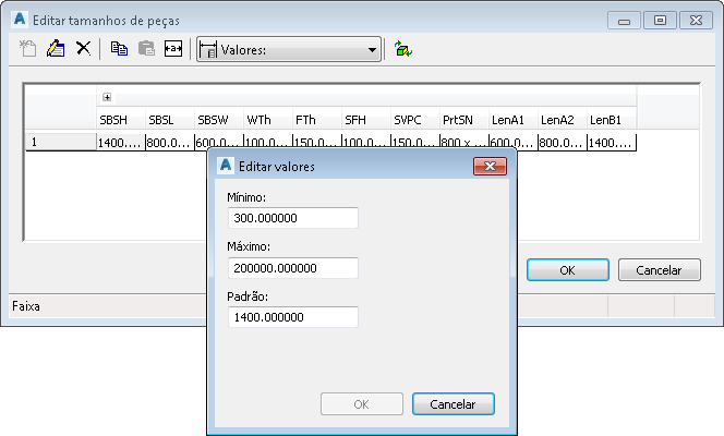 - Para adicionar novos tamanhos para a peça, clique um valor de parâmetro, tal como o parâmetro LenB1, e clique em Editar na barra de ferramentas.