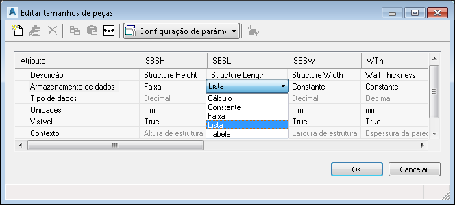 - Para adicionar uma lista de tamanhos de peças disponíveis para a peça, altere o tipo de armazenamento de dados de um parâmetro de tamanho para Lista.