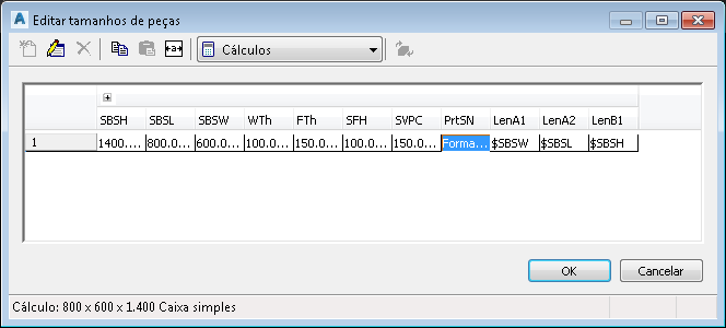 - Para especificar um nome de tamanho de peça calculado único, selecione Cálculos na caixa de listagem da barra de ferramentas.