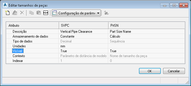 A caixa de diálogo Editar tamanhos de peça é exibida, mostrando todos os parâmetros de tamanho no momento disponíveis para a peça selecionada. Para o exemplo de Estrutura cilíndrica simples, alguns parâmetros de tamanho de peça são Nome do tamanho da peça (PrtSN) e Folga da tubulação de estrutura vertical (SVPC).