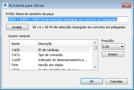 As sequências de cálculo associadas com os valores do parâmetro são exibidas. Por exemplo, a fórmula de cálculo para um Nome de tamanho de peça (PrtSN) para uma estrutura deveria ser “SHBW x SHBTh x SBSH polegadas da Parede de Retenção de Concreto”. Ou para uma tubulação, poderia ser FormatNumber($PID,0) + “ polegadas de Tubulação de Concreto”.
