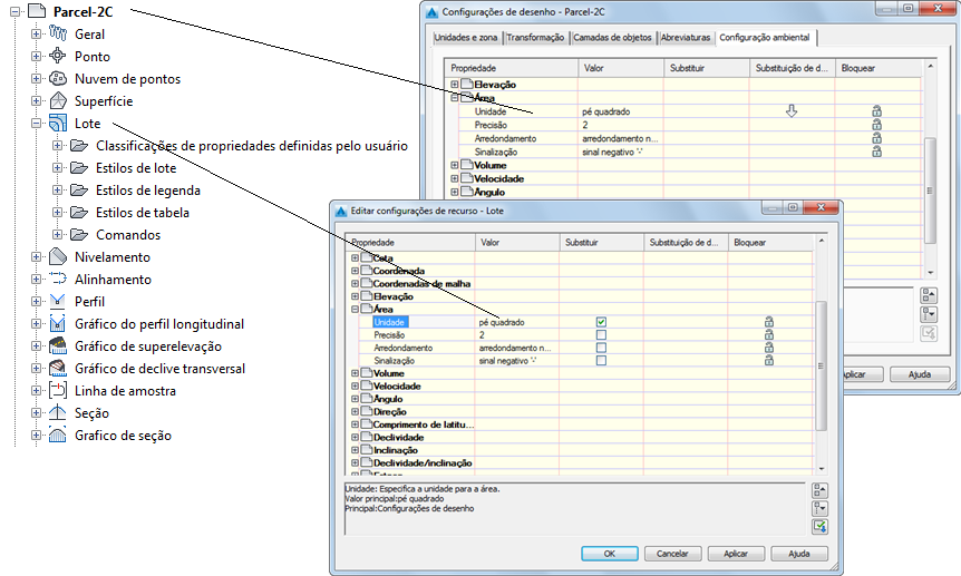 A marca de seleção na coluna Substituir da caixa de diálogo Configurações de terreno (desenho inferior) indica que o valor definido nesta caixa de diálogo substitui a configuração em um nível superior.