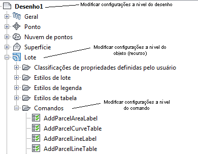 Autodesk Civil 3D tem as configurações de desenho, objeto e comando. Todos os três níveis de configurações no Autodesk Civil 3D são salvos com o desenho e podem ser salvas em um modelo de desenho.