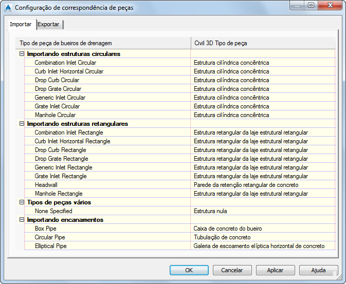 A guia Importar permite selecionar uma família de peças do Autodesk Civil 3D (à direita) a ser utilizada para cada Tipo de peça disponível do Storm Sewers. O Tipo de peça do Storm Sewers é uma lista fixa. Este mapeamento deve ser equivalente ao mapeamento de exportação para que as famílias de peças permaneçam as mesmas.