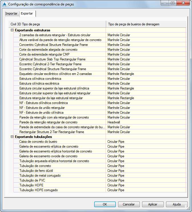 A guia Exportar, conforme mostrado abaixo, permite selecionar qualquer um dos Tipos de peça do Storm Sewers disponíveis (à direita) para corresponder a cada um dos Tipos de peça do Autodesk Civil 3D encontrados no Catálogo de peças atual. Os Tipos de peça do Autodesk Civil 3D mostrados são atualizados com base em alterações feitas no Catálogo de peças.