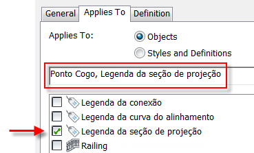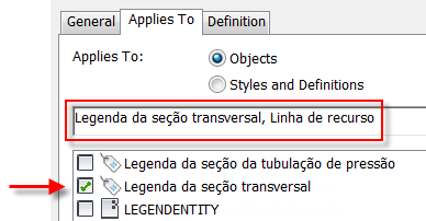 Se você desejar incluir dados de conjunto de propriedades em estilos de legenda de cruzamento, você precisa selecionar o tipo de objeto Legenda de seção de cruzamento além do tipo de objeto cujo local de cruzamento é mostrado no gráfico de seção.